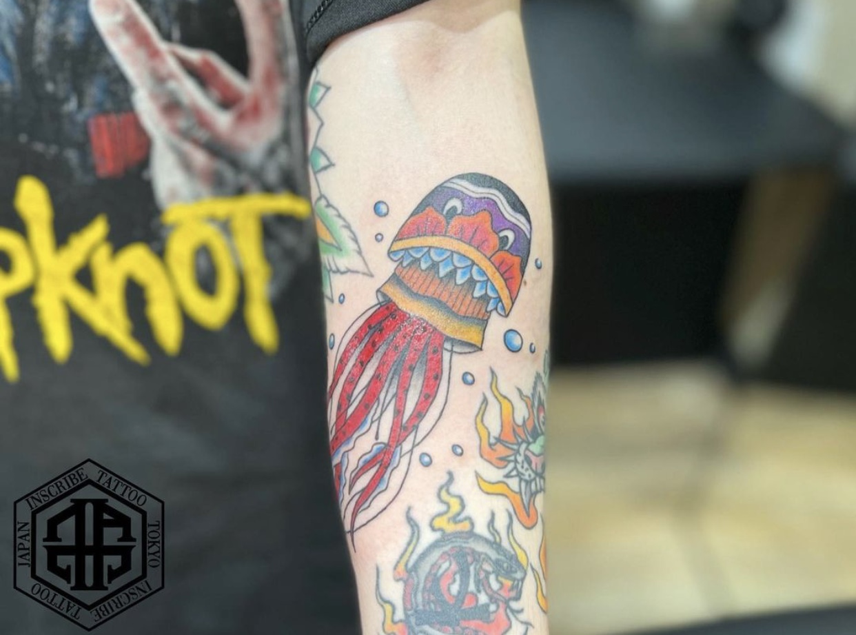 クラゲをモチーフにしたデザインを、カラーで施術したタトゥー・刺青です。