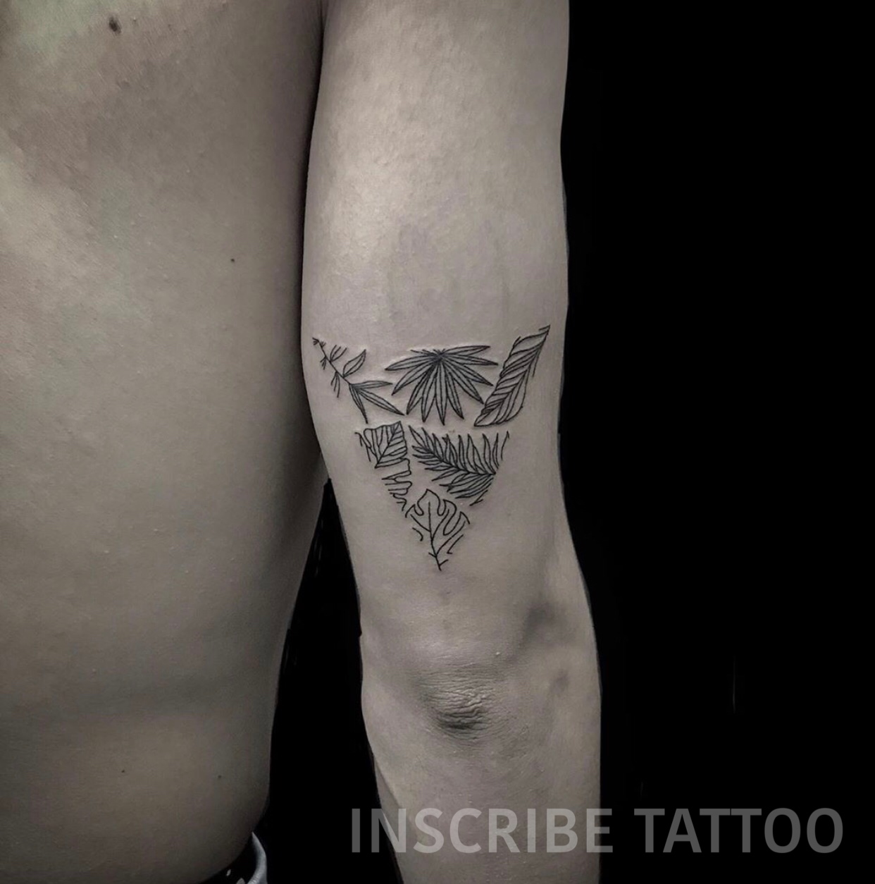 腕に色々な種類の葉っぱをモチーフに逆三角形にまとめてデザインしたワンポイントタトゥー・刺青です。