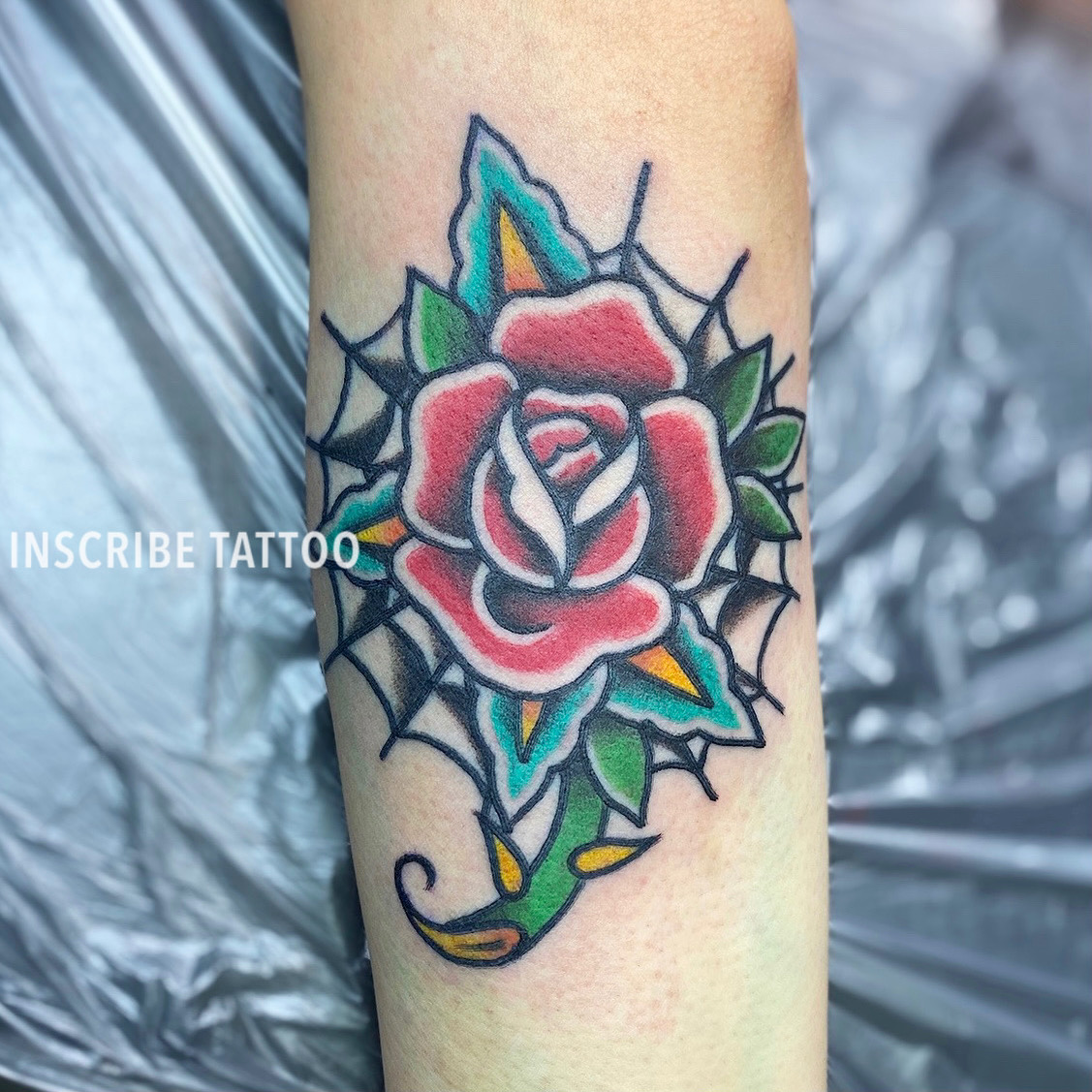腕にアメリカントラディショナルスタイルの薔薇と蜘蛛の巣を描いたタトゥー・刺青です。