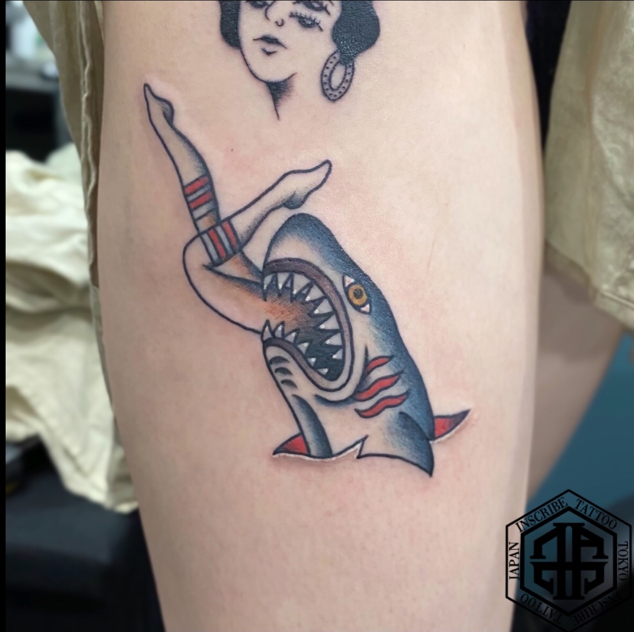 タバコサイズでトラディショナルで描いたサメのタトゥーです。