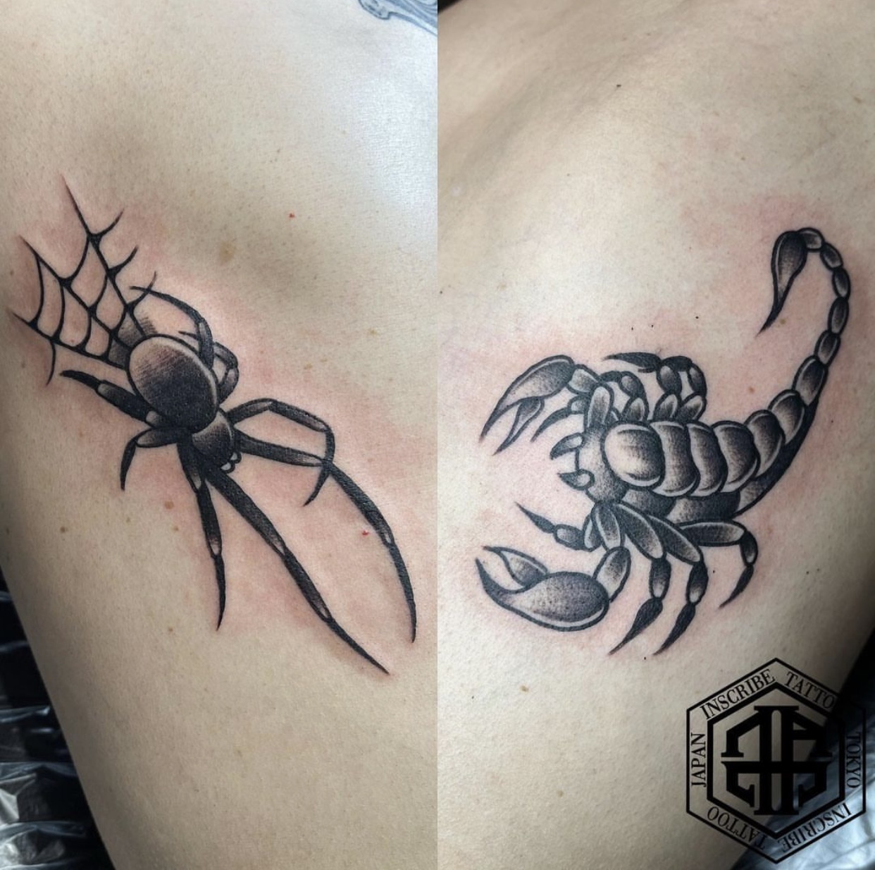 サソリとクモをそれぞれ両脇腹に施術したタトゥー・刺青です。
