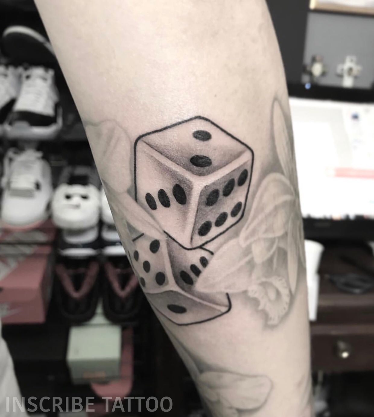腕にサイコロをモチーフにブラック&グレーでデザインしたタトゥー・刺青です。
