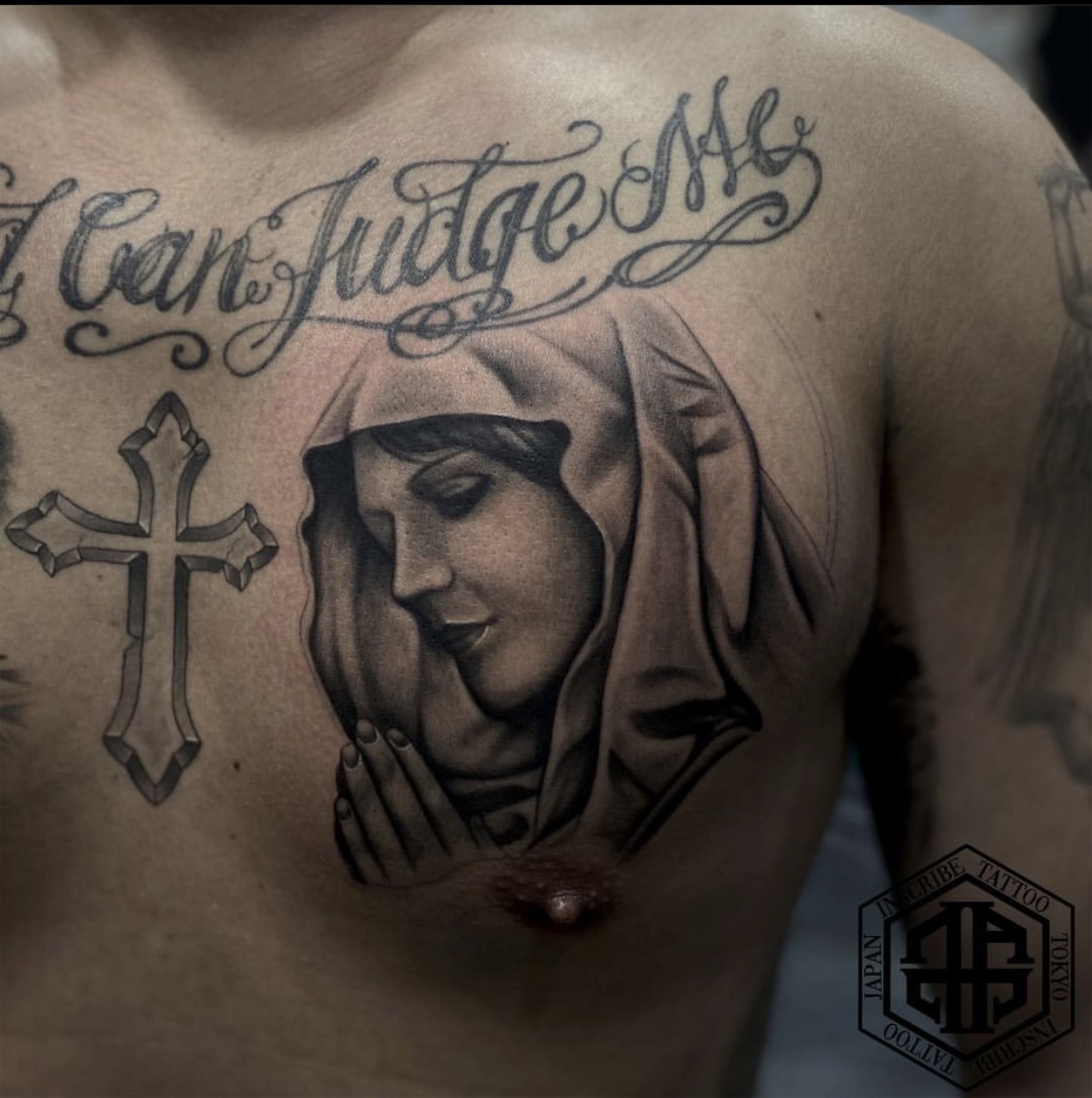 胸にマリアをブラックアンドグレーでリアルに描いたタトゥーです。