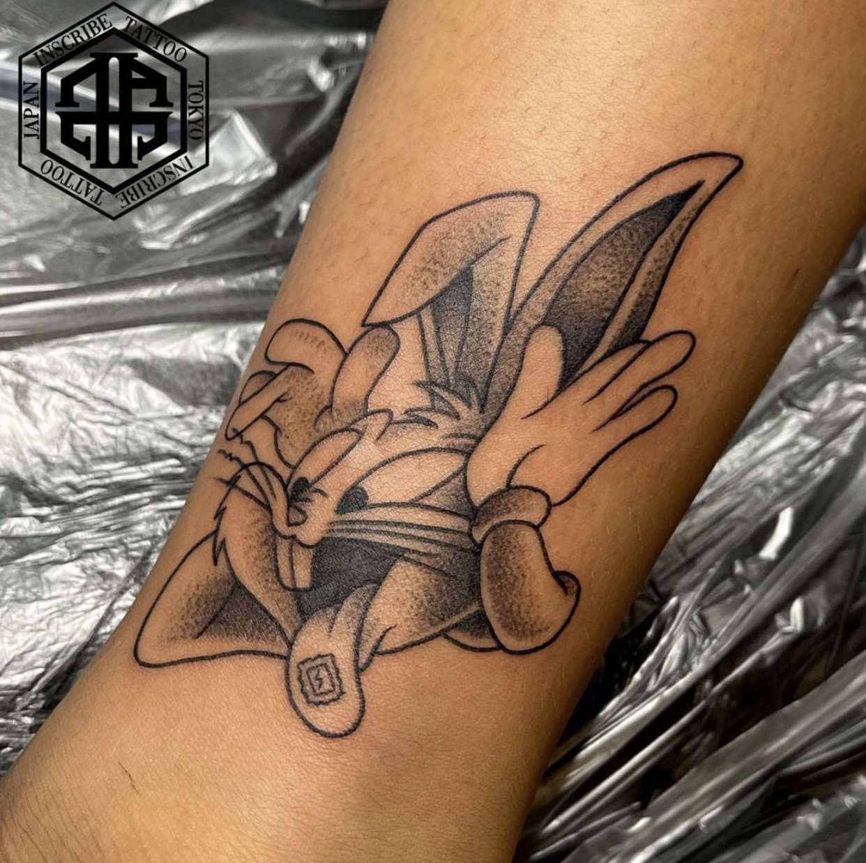 腕にバックスバニーのデザインをブラックアンドグレーで施術したタトゥー・刺青です。