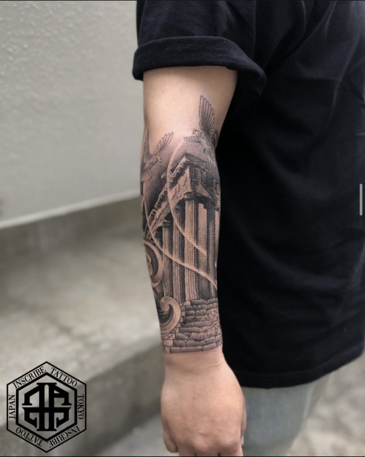 腕に古代ローマの神殿をブラックアンドグレーで施術したタトゥー・刺青です。