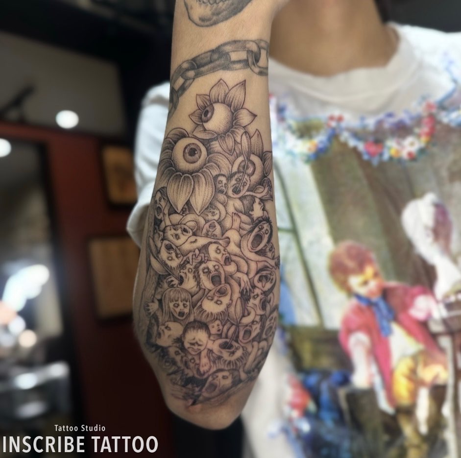 前腕に花、目玉、人の集まったタトゥー、刺青です。