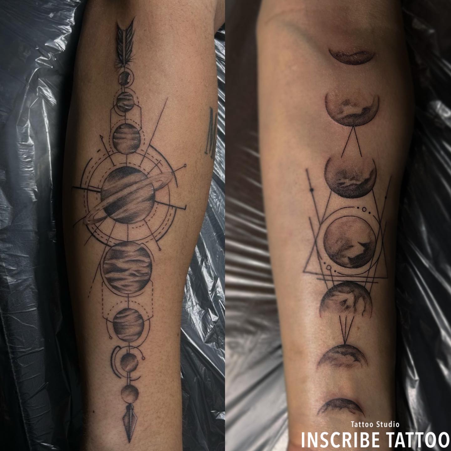 腕に月と惑星のジオメトリックタトゥー、刺青です。