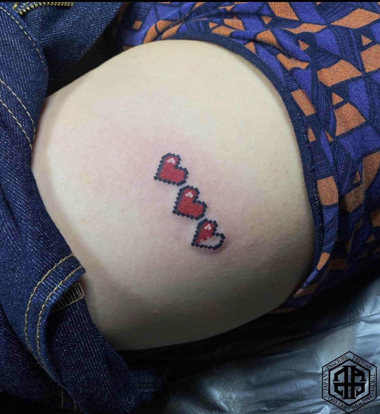太腿にカラーで、ドット絵風のハートを施術したタトゥー・刺青です。