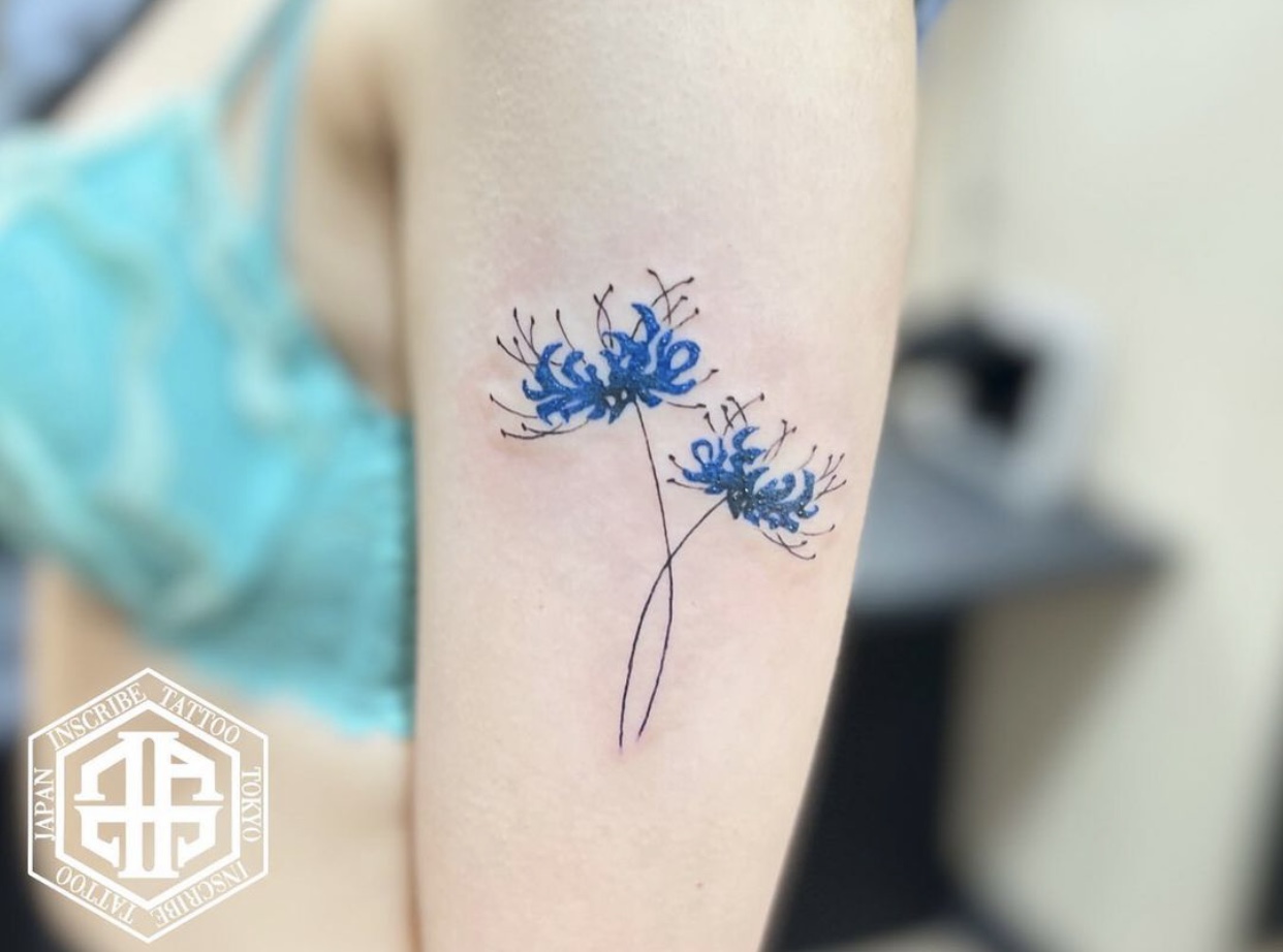 彼岸花は赤や白などのイメージがありますが、タトゥーでは青い彼岸花も再現が可能です。