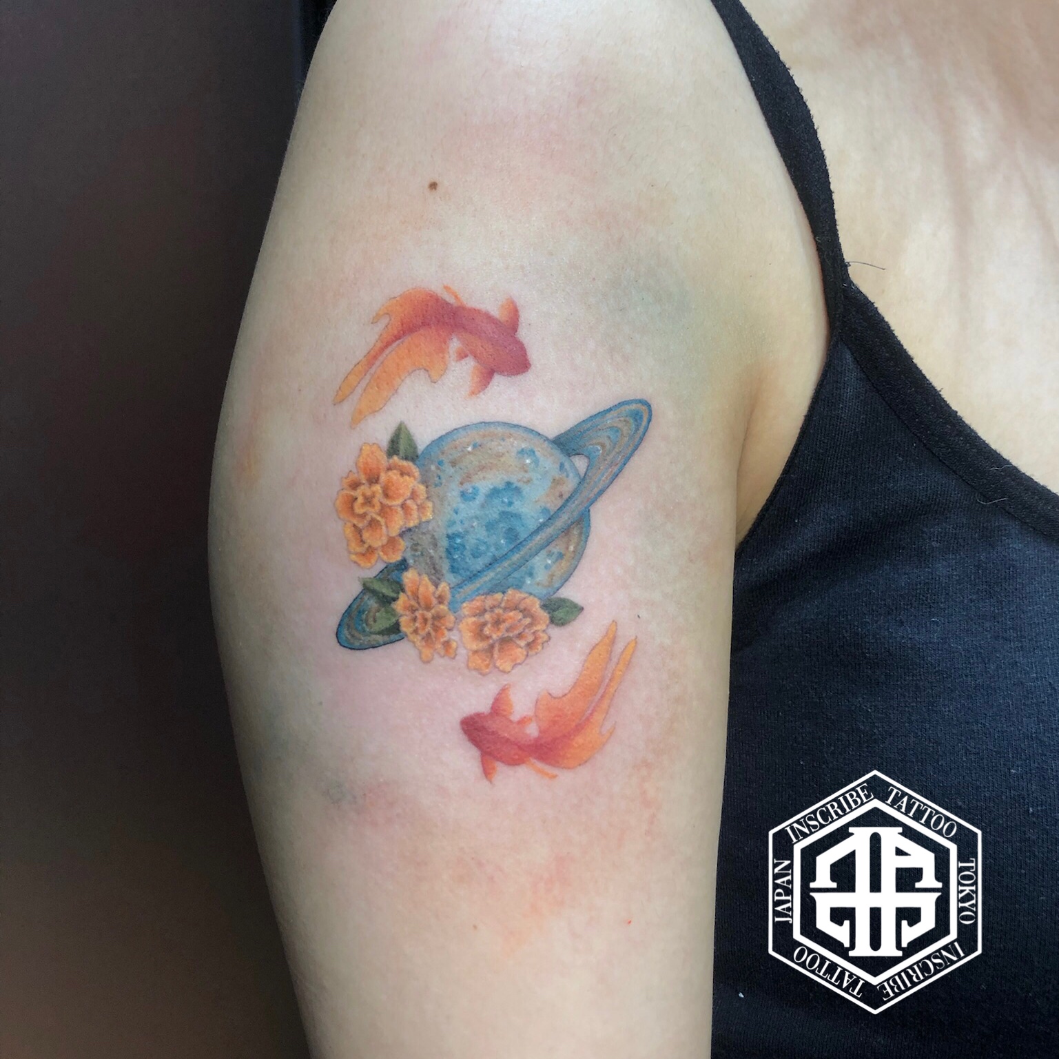 金魚と花と惑星を組み合わせた タトゥー・刺青です。