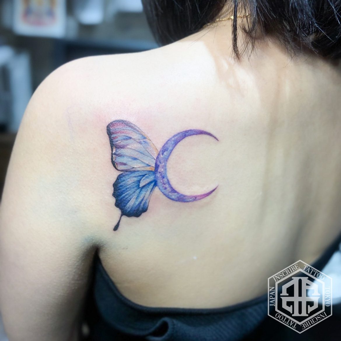 背中に蝶々と月を合わせたタトゥー、刺青です。