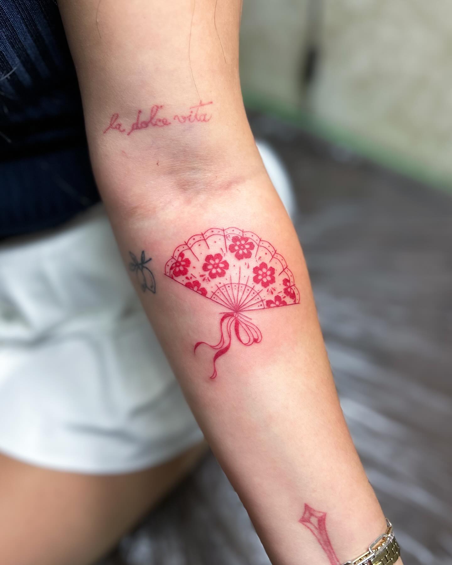 腕に扇子と桜を組み合わせたワンポイントタトゥーです。