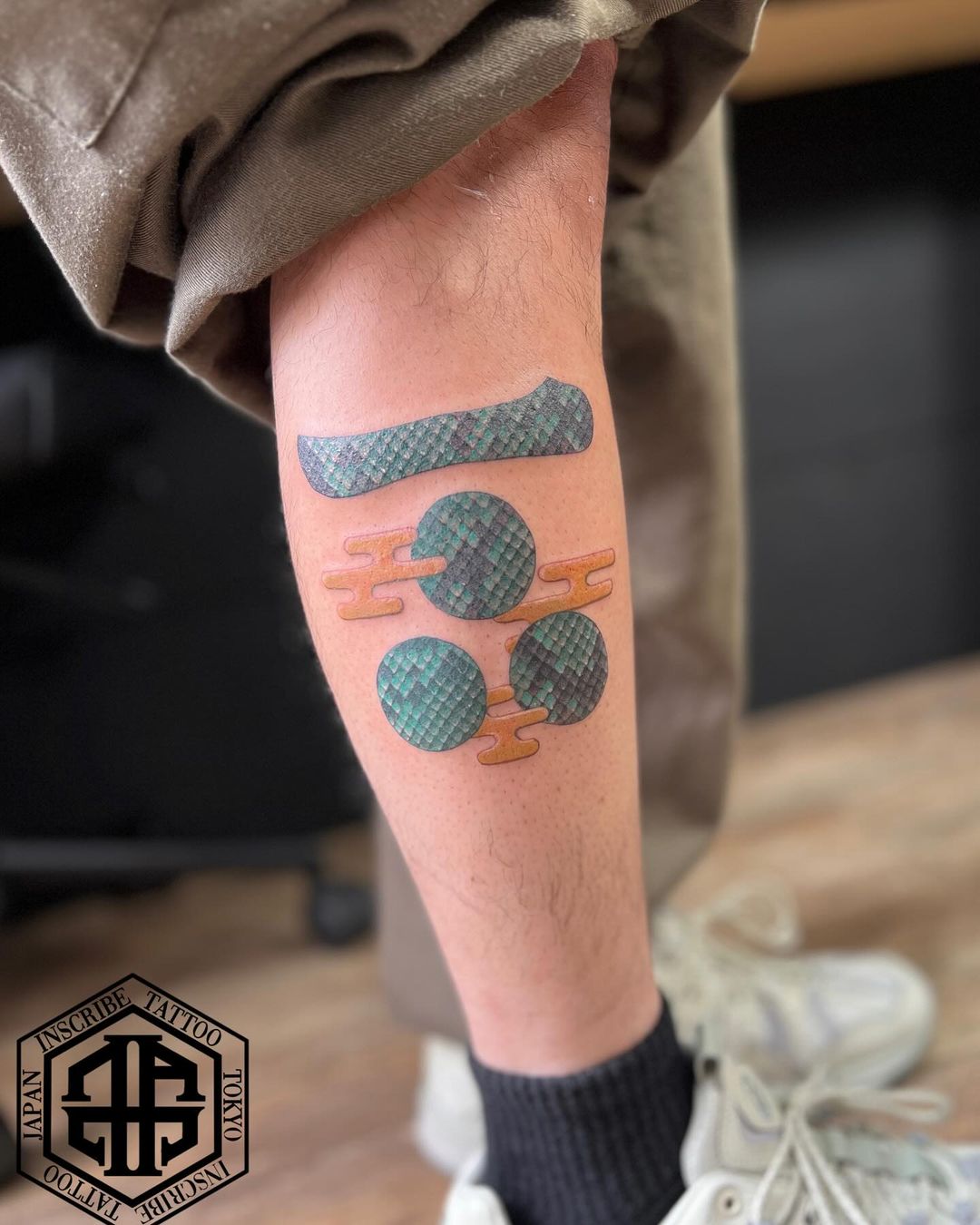 脹脛に蛇柄の家紋のタトゥー、刺青です。