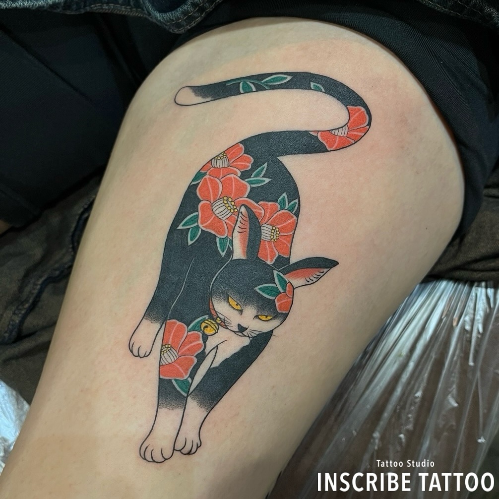 太ももに牡丹柄の猫のタトゥー、刺青です。