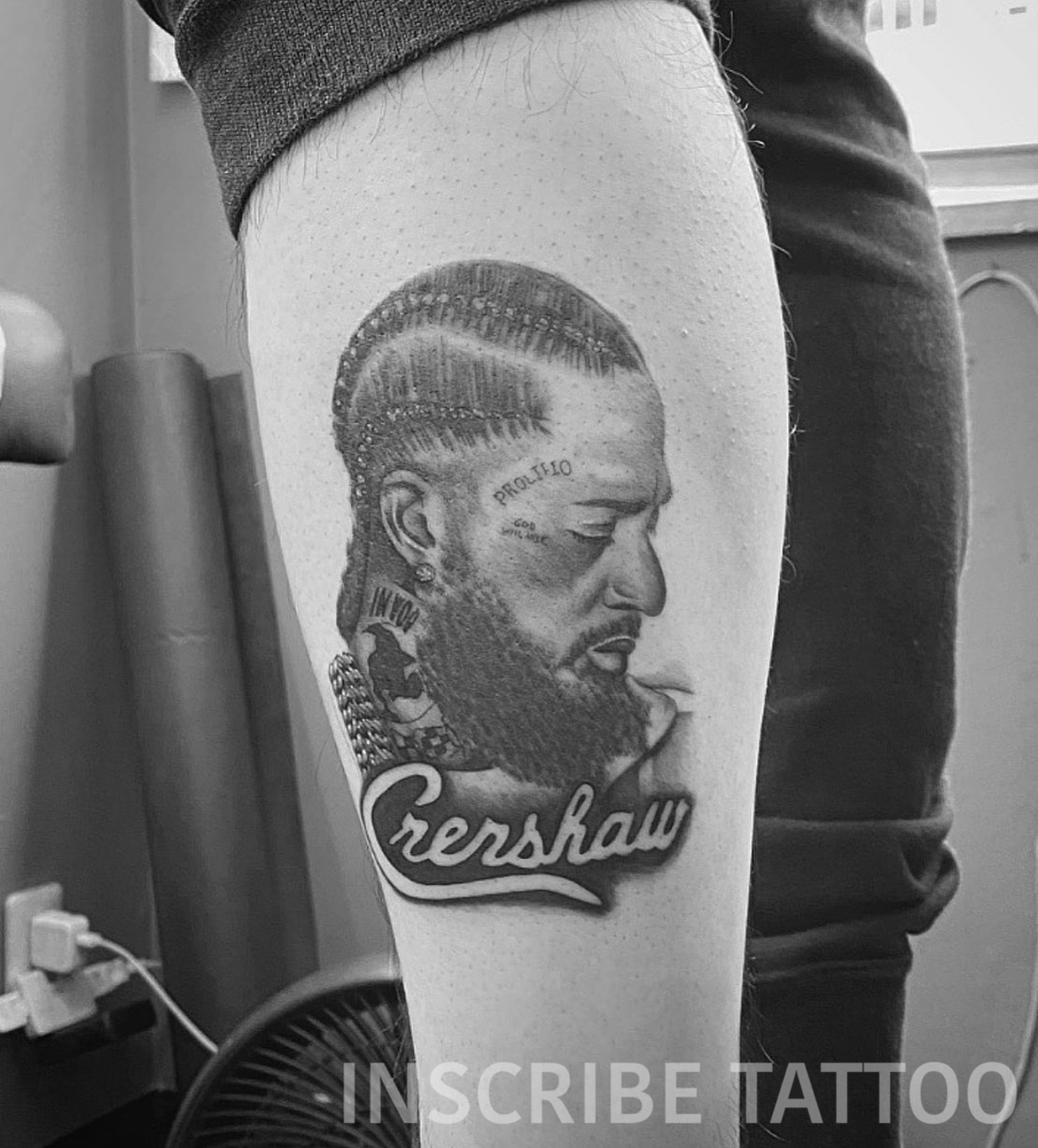ふくらはぎへ、ラッパー ニプシーハッスルのポートレートタトゥー・刺青です。