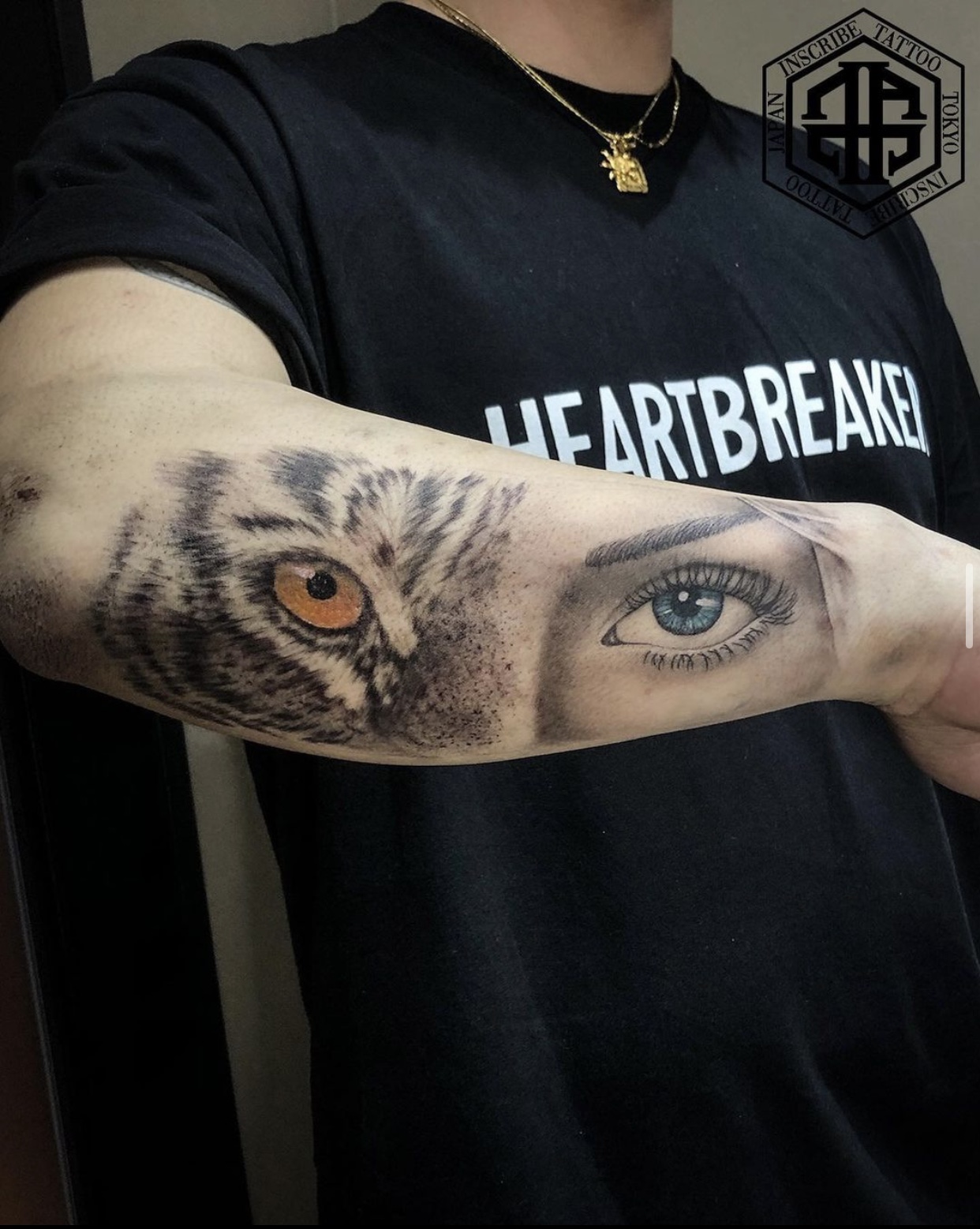 人と虎の目をポートレートで施術したタトゥー・刺青です。