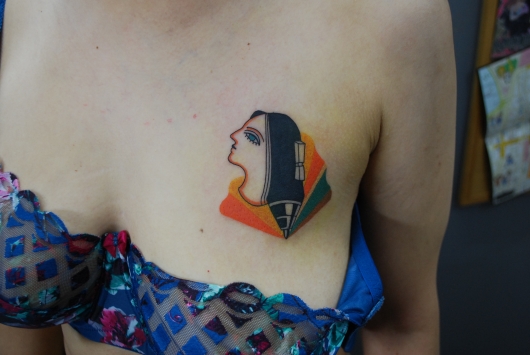 ペンと女性をモチーフにしたデザインのタトゥーです。