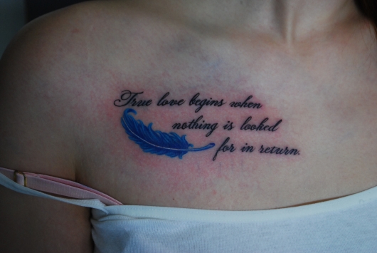 文字と羽をモチーフにしたデザインのタトゥーです。