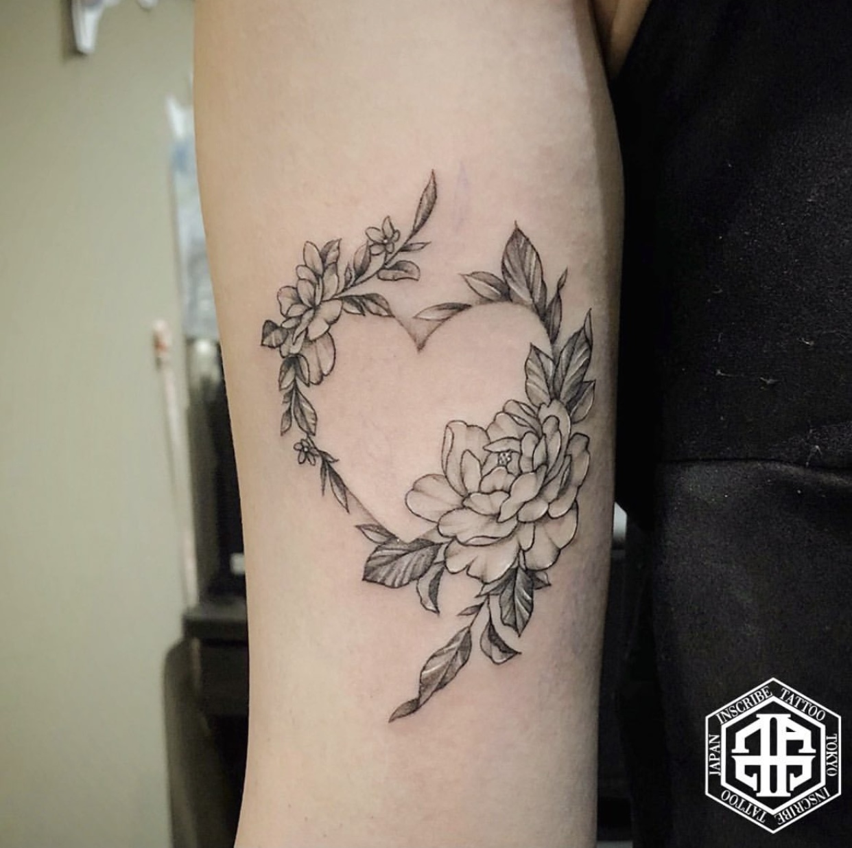花と葉っぱでハートを描いたデザインのタトゥー・刺青です。
