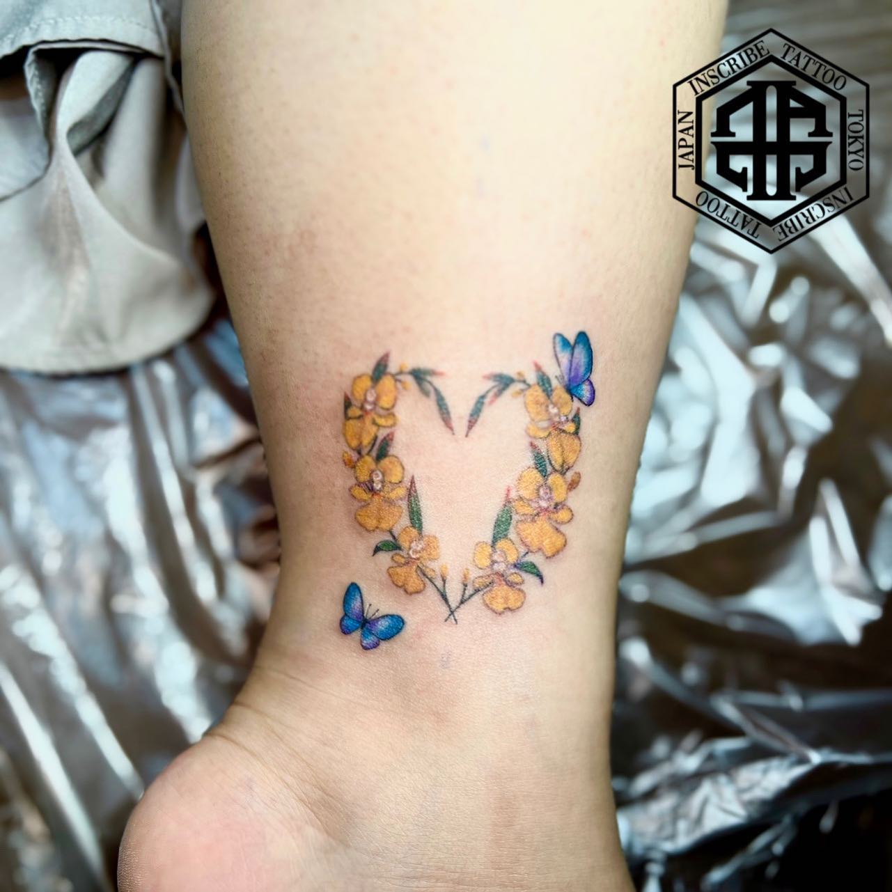 足首にハートの形に沿ったお花のカラータトゥー、刺青です。
