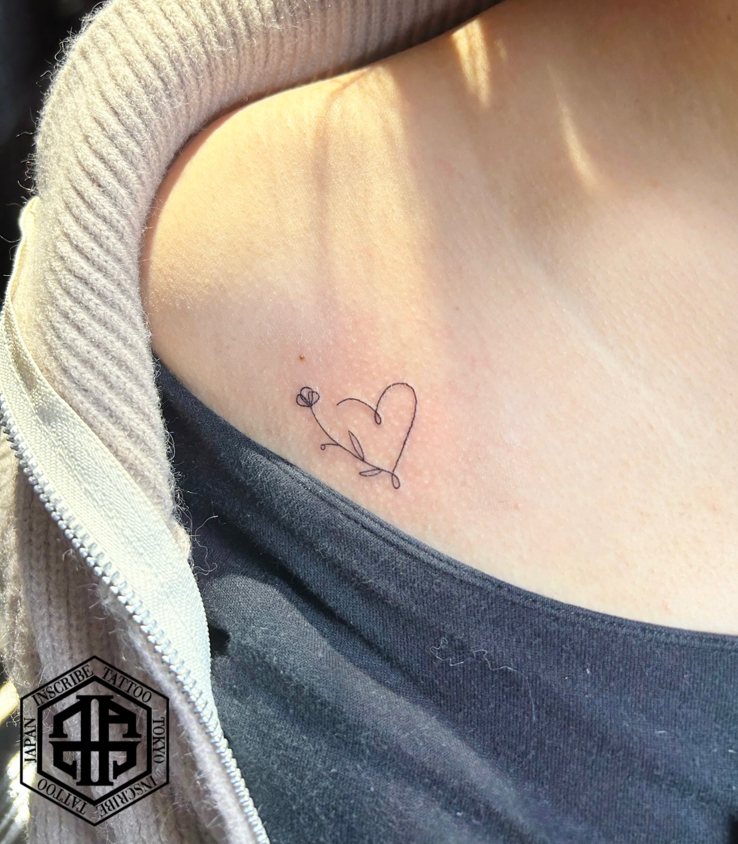 胸に花でハートのタトゥー、刺青です。