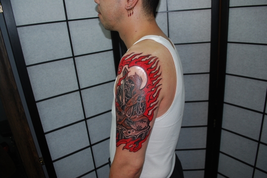 不動明王をモチーフにしたデザインのタトゥーです。