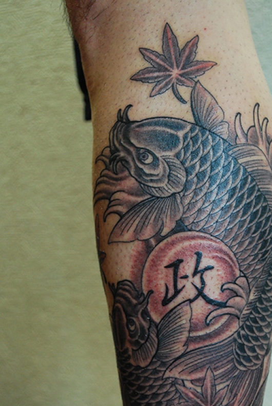 鯉と文字と紅葉をモチーフにしたデザインのタトゥーです。