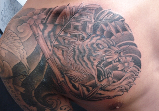 虎と竹と桜をモチーフにしたデザインのタトゥーです。