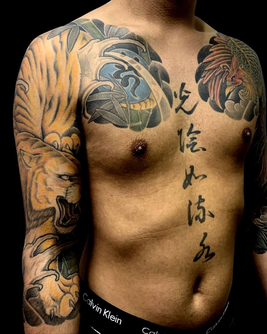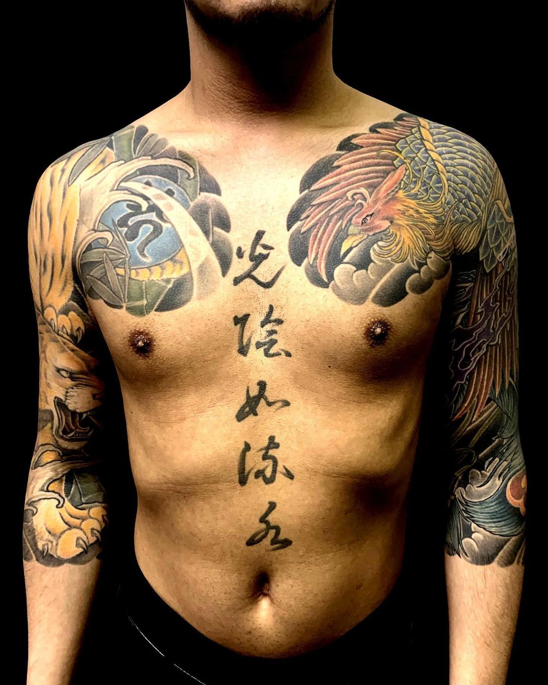 腕に鳳凰と虎を額彫りかいな七分袖で仕上げた和彫り刺青です。