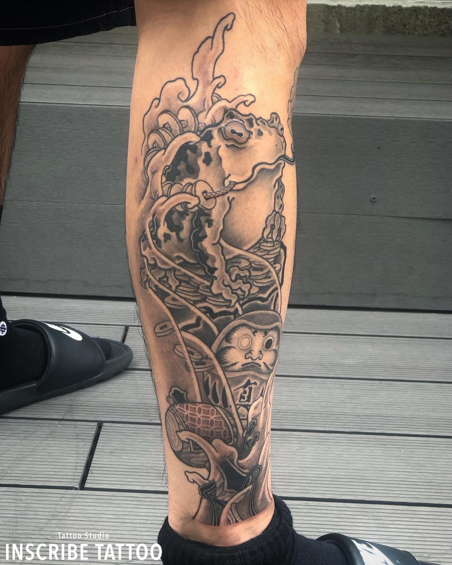 脹脛に錢蛙と達磨と打ち出の小槌のタトゥー、刺青です。